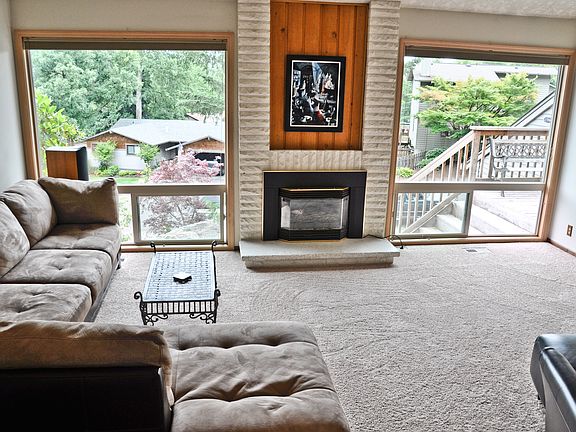 Classic Northwest contemporary with soaring vaulted ceilings and architecturally interesting floor plan. Mountain view is from lofted den on upper level, living room, and one bedroom. Updated insulation. Storage galore. Backs to greenway. Large backyard deck with hot tub. Great location with easy access to restaurants and shopping.