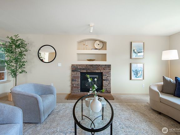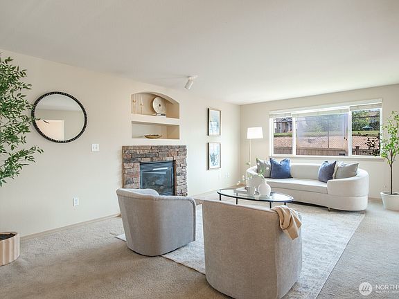 Attractive Panther Lake home features open-concept design, effortlessly connecting kitchen, dining & living areas. Spacious kitchen is equipped with newer appliances, lots of cabinets, pantry & open bar seating. Kitchen flows seamlessly to spacious living area, complete with gas fireplace. Step outside sliding doors to level deck & small private, fenced yard. Enjoy views overlooking quiet community space, w/ no neighbors behind. Upstairs can be used as 4 bedrooms or 3 bedrooms + bonus room. All bedrooms are sizable & primary suite includes generous walk-in & ensuite. Rare 2 car garage + parking in front. This well-maintained community has 3 green spaces, conveniently located near Safeway, library & Cayush Park. Ideal rental or future abode!