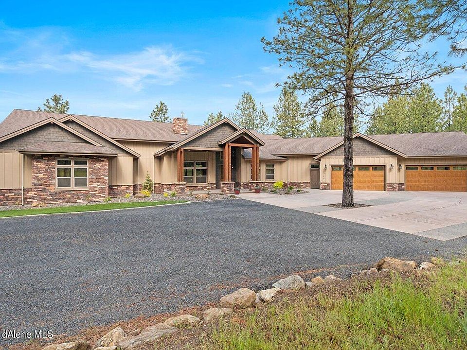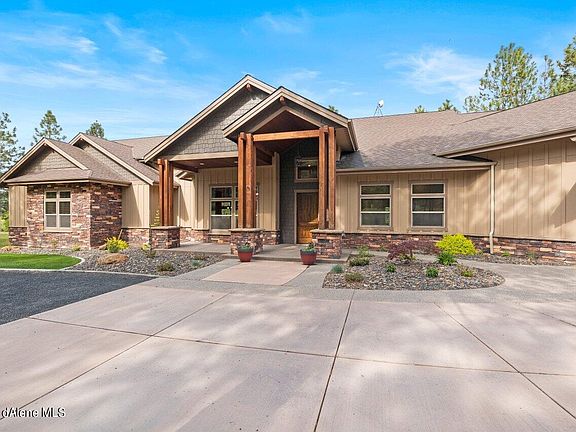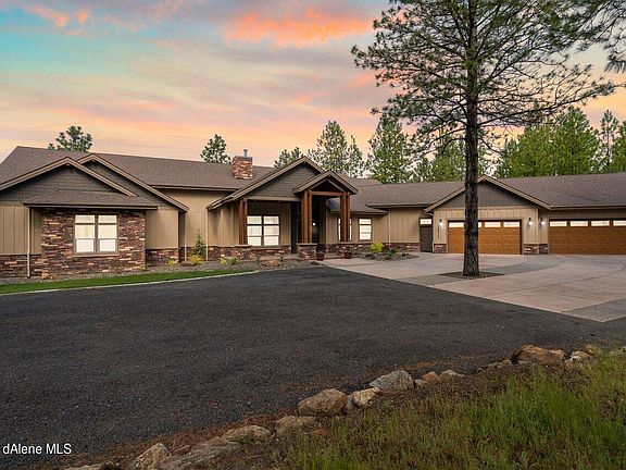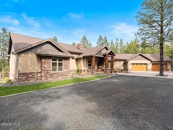 Custom home on 4.5 acres in Post Falls! This home is just under 3800 sq ft with 4 bedrooms, 3.5 bathrooms, and an amazing great room with beautiful wood floors. A 2-sided floor-to-ceiling stone fireplace with a sitting area or breakfast room behind it. The forest views are framed by large windows bringing the outdoors in, and a large, covered deck to enjoy the fresh air and serene property. The custom cabinetry and high-end appliances are stunning in the open kitchen. Enjoy a large walk-in pantry to keep all your small appliances organized. The Primary suite has a coffered ceiling and a large window for views, his/her vanities, and a beautiful tub and separate walk-in shower. The three other bedrooms are very roomy as well! Large 4-car garage for your toys or take advantage of the 4.5 acres and build a shop! Basement walk-in storage area. Energy-efficient heat pump with a humidifier. Easy access for I-90 commute. Approximately 35 minutes to Spokane Airport and 30 minutes to downtown Spokane.