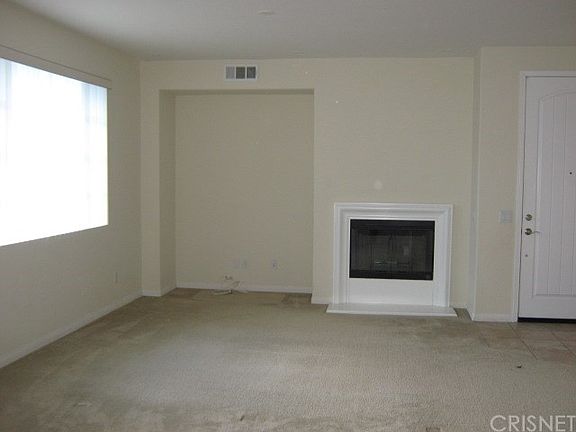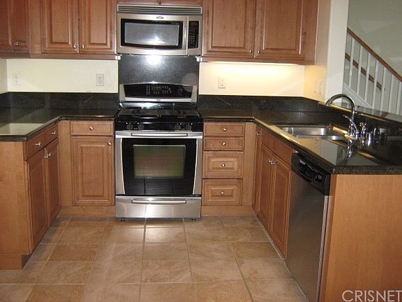 Spacious three bedroom townhome with NO Mello-Roos in Saugus with backyard. The entryway has tumbled travertine flooring and leads to a large living room with entertainment niche, gas fireplace and has a dual pane sliding glass door leading to a nicely landscaped backyard and patio. The kitchen has tumbled travertine flooring, maple cabinets, stainless steel appliances, granite counter tops, recessed lighting and dining area with cabinets. Kitchen appliances include: stove, dishwasher and microwave. The downstairs laundry room has direct access to the attached two car garage. Half bathroom downstairs with pedestal sink. Upstairs built in study area with built in desk. Two guest bedrooms with ceiling fans, one of them has mirrored closet doors. Full guest bathroom. The master bedroom has a ceiling fan and walk in closet. The master bathroom has an oval bathtub and separate shower. Enjoy the HOA pool and spa area and playground.