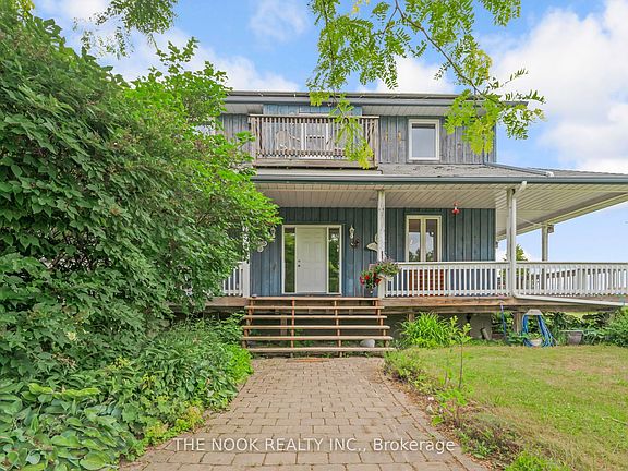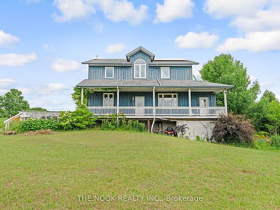 Welcome to your private country escape, a custom-built farmhouse nestled on eighty-eight acres of rolling land and woods. Perfectly positioned between Port Perry and Raglan and just minutes from the free 407, this home offers both convenience and total seclusion. From every angle, sweeping views surround you, with not a neighbour in sight. Inside, the heart of the home is a spacious kitchen with granite countertops, a built-in stove, a centre island, and more cabinetry than you could hope for, designed for gathering, cooking, and entertaining with ease. The bright living room and formal dining room open to an expansive wraparound porch, creating the perfect flow for indoor-outdoor living. A cozy three-season sunroom offers yet another place to unwind and take in the scenery, while the main floor office and powder room add thoughtful function. Upstairs, three generous bedrooms and a five-piece bathroom provide comfort for the whole family. From the second floor, step onto the balcony and watch the sun set over the northwest horizon. The central staircase connects every level beautifully, leading down to a finished walk-out basement with its own kitchenette, laundry, propane fireplace, and fourth bedroom ideal for extended family or private guest space. This home is as practical as it is picturesque. Owned solar panels generate extra income that more than cover the annual electric costs. A 200-amp service supports modern living, and twenty-seven acres of environmentally protected land preserve both natural beauty and lower taxes. Custom built and cherished by the original owners, the property embodies pride of ownership and timeless country living. Whether you imagine a forever family home, a hobby farm, or a retreat from the world, this sanctuary offers it all.