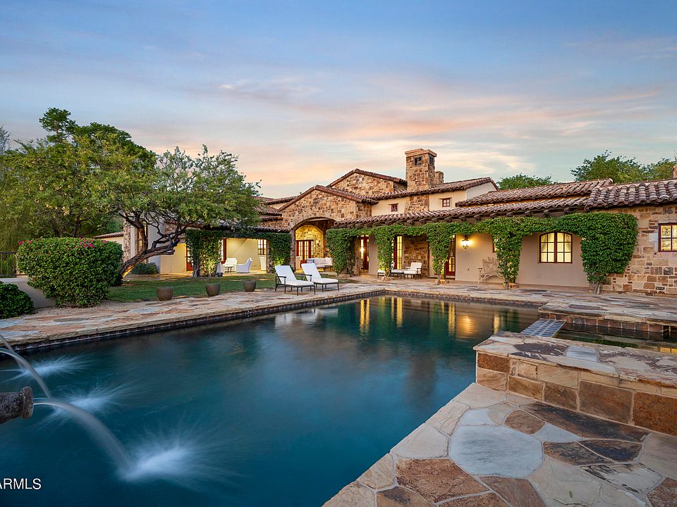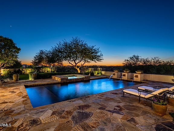 The private primary retreat offers a sitting room with a cozy fireplace, a coffee/beverage center, his and her closets, his and her water closets, and a grand two-sided entry steam shower. Wine enthusiasts will appreciate the dedicated wine tasting room with a temperature-controlled wine wall that holds 864 bottles, complemented by an additional wine cellar for 212 bottles. The backyard is an entertainer's paradise, perfect for enjoying spectacular Arizona sunsets with a heated pool and spa, serene water features, electric sun shades, an outdoor kitchen, and a wood-burning fireplace.