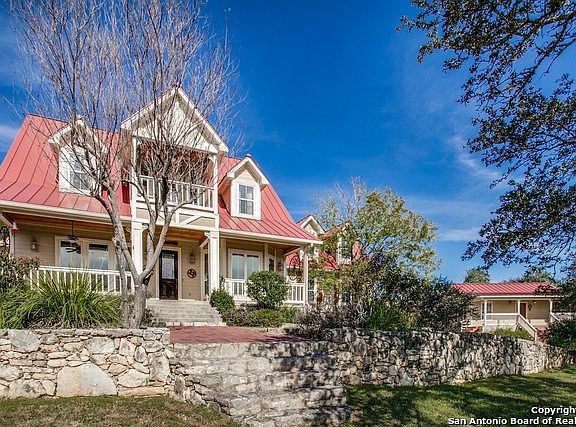 The ultimate in Hill Country living, including an 896sf charming GUEST HOUSE with accessible features. Located on top of a hill providing serene and fantastic views from your porch for miles and miles. Open layout perfect for entertaining. A large island kitchen with granite/quartz counters and stainless-steel appliances installed in 2014. Lots of built ins and storage. The huge master suite boast a porch with fabulous views. Bonus room could be a game, or guest room! Washer, Dryer and Refrigerator convey.