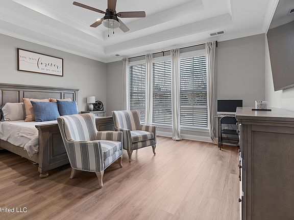The spacious master suite includes a sitting area, a luxurious walk-through shower with dual shower heads and a rain downspout, a his-and-her vanity, a soaking tub, and a double-tray ceiling with recessed lighting. The laundry room is well-equipped with built-in cabinets and a sink.