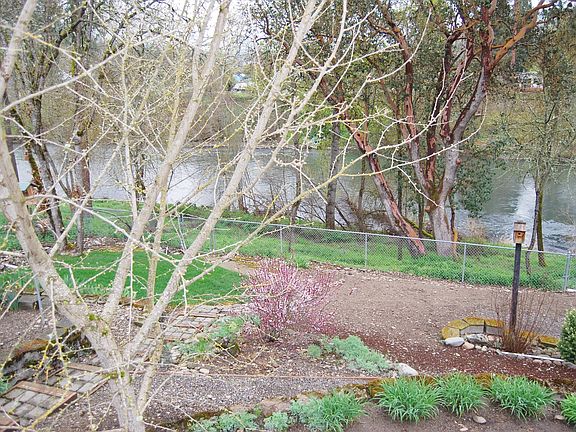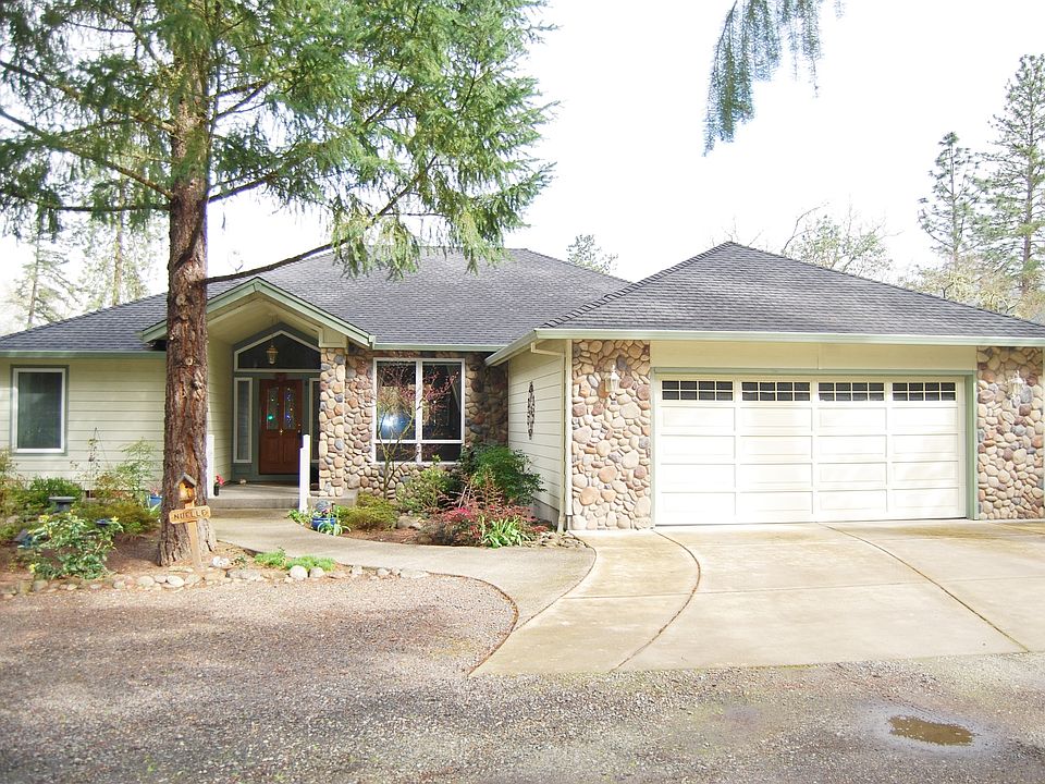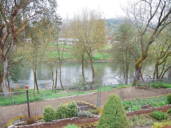 Beautiful, Riverfront, single level home nestled in the trees & in move-in condition! Home sits well off the road through a forested setting, & opens to a sun drenched home, gardens, & terraced rear yard all overlooking the amazing Rogue River. Curb appeal with stone accents & a dramatic entry. Formal Dining w/hutch alcove. Great Room w/ceiling fan, pellet stove, built-in bookcases, & overlooks river. Bright kitchen w/skylight, white cabinets, granite counters, tons of pantry storage & built-in desk. Nook overlooking the river. Hardwood floors in all main living areas & down a hallway. Indoor utility w/sink. Master Bedroom with slider to rear yard, master bath with jetted tub, separate shower, water closet, dual vanities, linen. Split Bedroom plan w/2 guest bedrooms & a spacious bath w/deep tub & marble surround. Garage is big enough for workbench, hobby room, water system. 16 x 8 shed has pull down stairs to storage and is insulated. Large rear deck to enjoy the flowers &fruit trees!