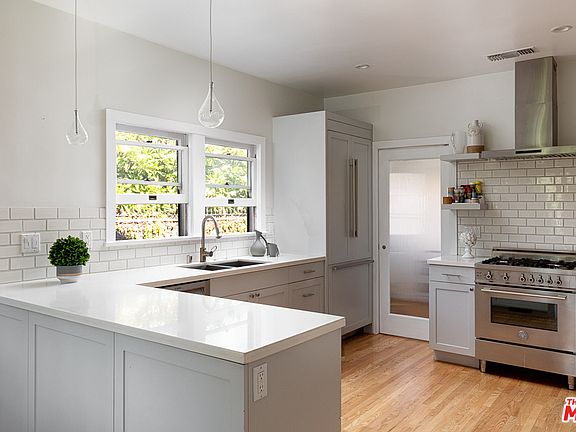 A classic California Craftsman with original period details adorn this rare game in the heart of the Hollywood Hills. 1946 Vine Street is a refreshed 2,574-square-foot home originally built in 1919. Located just east of Hollywood Hills near Griffith Park, this 3-bedroom (all ensuite), 3.5-bathroom gated home is situated behind privacy-enhancing hedges on a sprawling, nearly 15,000-square-foot lot. Inside, interiors are replete with wood floors, curved doorways and white paneled walls and ceilings. The updated kitchen is equipped with a chef-grade stove and opens to the lush front yard through French doors. Outside, find a covered patio, multi-level grass lawns and a custom deck that looks out onto sweeping treetop views of the neighborhood below and Griffith Observatory beyond. Stairs lead down to a more private expanse of grass, ideal for stargazing. There is also a converted garage that can be used as a great home office or guest quarters.