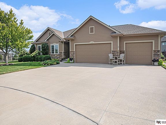 Welcome to this beautifully maintained ranch home offering over 3,300 finished square feet, ideally situated on a cul-de-sac with a flat lot in the highly sought-after Gretna School District. Step inside to an open floor plan featuring soaring 11-foot ceilings, freshly painted interiors, and new baseboards that create a modern move-in ready feel. The spacious kitchen and living area flow seamlessly to a covered stamped concrete patio-perfect for entertaining or relaxing outdoors. This 4-bedroom, 3-bath home includes a fully finished basement, providing plenty of space for recreation, hobbies, or guests. Practical updates and upgrades include a roof replaced in 2019 with Class 4, impact resistant shingles, an oversized garage with extra storage, and a pre-inspection for added peace of mind. Don't miss the chance to own a stylish ranch with generous space, thoughtful updates, Gretna Schools, and a prime cul-de-sac location.
