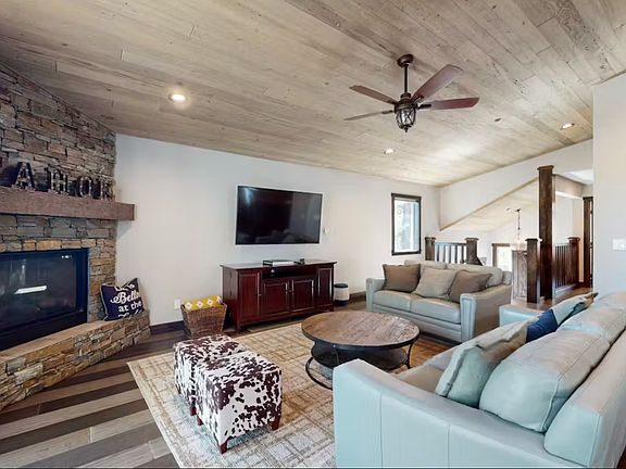 With vaulted pine ceilings and a dramatic stone fireplace, the upstairs living area is prime for relaxation. Sink into leather sofas and watch shows on the 65-inch TV. The lower-level living room is perfect for entertaining with two leather sofas, a 50in TV, Xbox, foosball table, and assorted games.