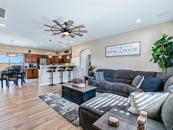 Nestled in Cimarron Lake, this attractive single-family residence presents an exceptional opportunity with Willow Valley Private Beach + Marina Access. This home comes FULLY FURNISHED, offering: 3 Bedrooms, 2 Bathrooms and a 55' Boat Deep Air Controlled Garage with Epoxied Floors. Built in 2021 and kept in great condition, it offers a modern living experience. The heart of this home resides in its kitchen, where culinary dreams come to life, featuring a Breakfast Bar that invite casual dining and conversation, while stone countertops and stainless steel appliances offer a touch of elegance. The open concept is perfect for both relaxation and entertaining. The walled backyard offers privacy/security with extraordinary mountain and sunset views! With views, an open floor plan, and situated in a rural residential area on the edge of the desert, this property offers a lifestyle of comfort and tranquility.