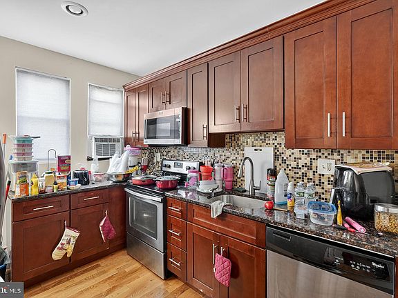 This two-story brick home offers 3 bedrooms/2 bathrooms across 1,266 sq. ft. of living space. The home sits on a .03 acre lot. The main floor features vinyl flooring throughout the living and dining areas which opens seamlessly to a kitchen equipped with wooden cabinets, stainless steel appliances, and a window-type A/C. The carpeted stairs lead to the upper level where all bedrooms include carpeting and individual window A/C units. A dedicated laundry area is located in the basement for added functionality. Outside, the home offers off-street parking with a private garage at the back. The stucco exterior is complemented by a charming front porch and detailed trim. The raised front yard showcases stone landscaping and mature greenery, creating a welcoming street presence.