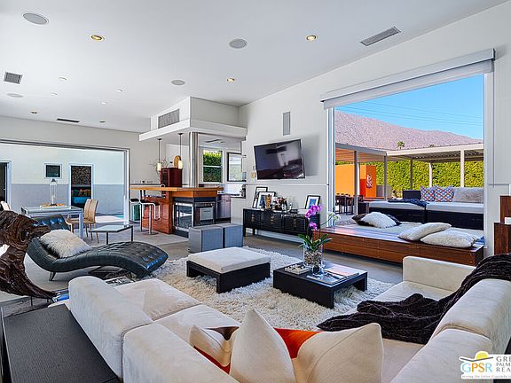 Available only Nov+Dec 2025. Seasonal Rental. This unique Palm Springs modem compound is in the popular Twin Palms Estates neighborhood. The walled and gated property features multiple structures and outdoor spaces, resort-style amenities, and architectural design reminiscent of the iconic Alexander butterfly mid-century modern homes. This Palm Springs home truly speaks to the Art of Desert Living, has been cited and featured in a variety of magazines worldwide and won Home of The Year in Metropolitan Home. The art of desert living is best exemplified in a property's outdoor amenities, and this property doesn't disappoint. Amenities include a 60 ft saltwater pool, large saltwater spa, outdoor kitchen, outdoor bed, 4 fire-pits, 2 outdoor showers and more. There is about 2,000 sqft of interior space spread out over 3 buildings. The main house consists of a living room, dining room and kitchen. All rooms have concrete floors and large sliding glass doors, that when opened, blur the line between indoor and outdoor spaces. The living room features a wall mounted TV plus a large seating area with L-shaped sofa, ottoman and 2 comfortable chairs. A large sliding glass door connects the living room to an outdoor bed with pool and mountain view. Next to the Dining room is the kitchen. The two rooms are separated by a breakfast bar with a built-in fireplace. The kitchen itself has a modem and commercial vibe and features high quality appliances including large stove top with grill, oven, wine refrigerator, refrigerator freezer and dishwasher. The adjacent dining room seats six and has two over-sized sliding glass doors. One of the doors opens to a wood bridge that spans the pool to secondary ensuite bedroom and the other door opens to an outdoor dining room, distinctive firepit seating area and a detached structure solely for the primary bedroom and bathroom. The Primary Bedroom is a stand-alone structure just steps away from the main house. Like the main house it has concrete floors and a large sliding glass door, that when opened, blur the line between your bedroom and the outside. Inside you'll find a King size bed, spacious closet, Smart TV and gas fireplace that separate the bedroom from the master bathroom. On the bathroom side, the fireplace is perfectly situated next to the large bathtub. Who needs candles when you can soak beside the flames of a roaring fireplace? There is also a large shower with waterfall shower head, two large sinks, a clerestory window and a door that opens to a private outdoor shower. The Guest bedroom/den structure features a guest bedroom with queen size bed and Smart TV. A bathroom connects it to the guest living room that features a couch that can sleep one, and another Smart TV. The main purpose of this Palm Springs modern compound is "rest, rejuvenation, and fun". Flanking the 60 ft saltwater pool, lounge chairs and large outdoor bed float above the water while the outdoor kitchen with gas grill, refrigerator and bar seating area anchor to the additional yard amenities. Next to the outdoor kitchen is a bubbling saltwater spa which is just steps away from an additional outdoor bed perfect for lounging. At the other end of the pool is the Pool House that provides an outdoor shower, cabana room and washer/dryer. On the other side of the compound is a distinctive seating area where guests can sit or lie on huge boulders encircling a recessed fire pit that shoots flames right out of the ground. This desert modern home is distinctive and award-winning; providing an elemental experience that includes earth, fire and water with a generous serving of Palm Springs architecture, upscale amenities and conveniences, and a chic urban vibe.