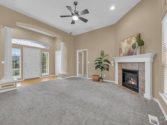 Welcome to this beautifully cared-for single-level home in the highly desired Boulder Creek neighborhood. From the grand entry with columns and archways to the spacious great room with tall ceilings and a cozy gas fireplace, this home offers timeless style and comfortable living. The kitchen features a gas range, solid-surface countertops, a tile breakfast bar, and an open layout perfect for everyday living and entertaining. The primary suite includes a relaxing corner tub, separate shower, dual vanities, and an oversized walk-in closet. Enjoy a generous corner lot with a large patio and room for utility parking. A 3-car garage provides plenty of storage and workspace. Immaculately maintained and move-in ready, this home offers space, charm, and an excellent location close to parks, shopping, and amenities. Buyer and buyer’s agent to verify all information.