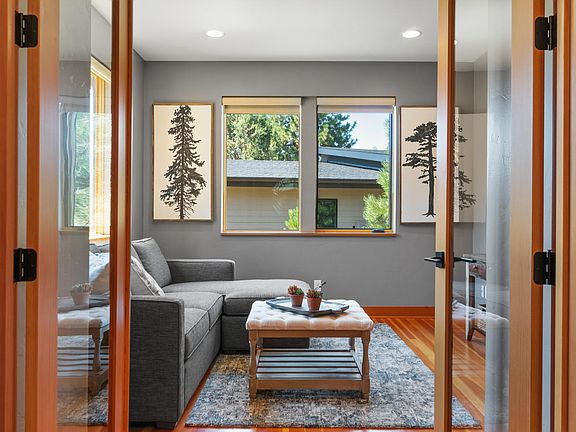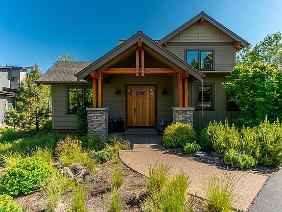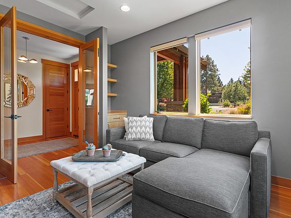 Tucked into the treed and natural landscape that is synonymous with the Glen neighborhood in Tetherow, this award winning NW Contemporary home delivers on all levels. Designed with sustainability in mind, the large sunny lot features great outdoor living for entertaining family and friends. The bright and airy feel of the main level is accomplished by high vaulted ceilings, transitional finishes, ample windows and an open concept floor plan. With a roomy and private primary suite as well as a dedicated office/den on the main level and two additional bedrooms, full bath and flex space upstairs, the design offers versatility and functionality for all buyer types. Plus with a nearly 3 car garage, there is plenty of room for all your outdoor toys. Set on a quiet cul-de-sac and just a short distance from all of Tetherow's fabulous amenities, this house perfectly blends comfort and convenience.