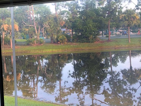 Anxious Seller- Relocating, Make Offer. Enjoy stunning sunsets and daylight views from your living room! Twin bay windows overlook the water, reflecting the signature trees of Pine Lakes Country Club. The turn-key home boasts of quality Caribbean-style rattan throughout. Spacious kitchen with center-island focal point, walk-in pantry, wall oven, and a ceramic stove update, adjacent to wet bar and cottage-core den. Huge master bedroom with luxurious ensuite bath, double sink vanity and walk-in shower. Second bedroom with ensuite bath. Sliding-glass doors lead to a generous lanai, perfect for entertaining. Laundry in the 1.5 car garage. Fruit-bearing avocado and mango tree. This 1,560 sq ft home (with an additional 377 sq ft lanai) comes 4-point inspected with a pass (no gray pipe/plumbing updated 2019, 8 year old roof). A fabulous location off the main road, yet steps away from a superabundance of community amenities -- Heated pool, spa, gym, library, pub/restaurant, pickleball, tennis, a large clubhouse for bingo, poker, billiards, monthly entertainment and much more. Two golf courses to choose from. Located on leased land with a monthly lot fee of just $1,473 on the water. An age 55+ gated community but age 40+ can be accepted. Priced to sell at $63,900.