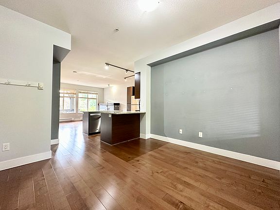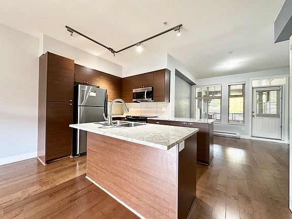 Welcome to Sunset Grove! This modern townhouse offers 1,071 sq. ft. of thoughtfully designed living space, featuring 2 bedrooms and 2 bathrooms. The bright, open-concept floor plan is enhanced by large windows, quality finishes, and stylish details throughout. The contemporary kitchen boasts a spacious island, quartz countertops, premium stainless steel appliances, and wide-plank laminate flooring. Step outside to enjoy a front patio and a large private patio in the rear, ideal for relaxing or entertaining. This home also includes two secure underground parking stalls and a storage locker. Perfectly situated within walking distance to Willowbrook Mall, cozy cafes, transit, schools, parks, and more this home combines comfort, convenience, and modern living.
