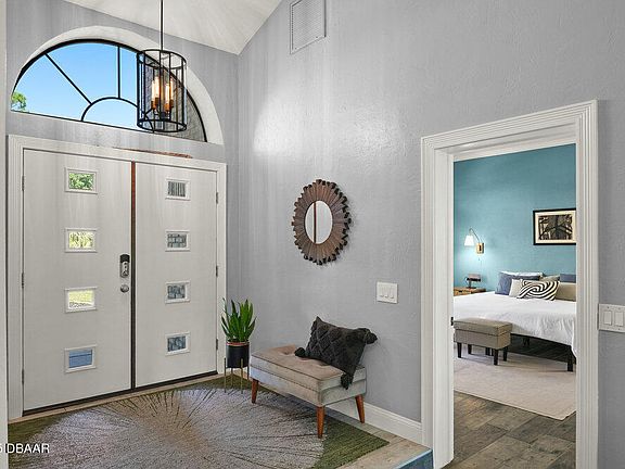 FULLY FURNISHED 5 bedroom 4 bathroom luxurious pool home sits in a private cul-de-sac with an elegant interior and high end finishes! This exclusive estate is in the desirable 24/7 guard gated Spruce Creek Fly-In with a rare 40x15 fully air-conditioned RV/boat garage with workshop, loft storage, OR an in-law suit! The living area boosts vaulted ceilings, modern fireplace, designer fixtures, Venetian plaster, & a 156'' HD projection screen with surround sound. The master suite features custom closets and the master bathroom has a spa-style shower with wet room, soaking tub, multi-spray/rain shower, and smart bidet. Split bedrooms for privacy. Formal dining room off the kitchen. Open floor plan great for entertaining. Built solid with concrete block & stucco/brick exterior, this home is a fortress and has never flooded! New metal roof (2025). Outdoors has a screened-in pool, shaded lounge, fire pit with blower, and electric Solar System. Your backyard view is acres of untouched land where you'll see wildlife and beautiful sunsets. Attached garage has a Stage 2 EV charger. Detached garage has a RV hookup. Enjoy private airstrips, hangars, golf course & pro shop, tennis & baci ball, trails, limo service, salon, massage, acupuncture and community events/holiday parties. 24 Hour security and video surveillance at playground/basketball/volleyball courts. Country club membership available with pool & gym. Multiple dog parks with one having a fishing dock on Spruce Creek. Downwind restaurant with full liquor bar. Great safe community for kids or to ride your golf cart around. School buses also come into the community to safely pick up & drop off your school kids! All of Spruce Creek is on private reverse osmosis water. One of the largest and most upgraded homes in this premier aviation community! Dont miss your opportunity on this turn key, one of a kind home in Spruce Creek!