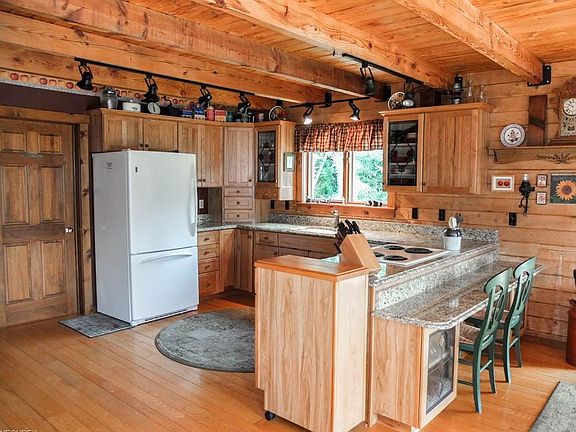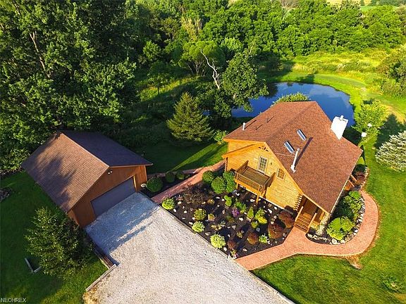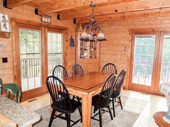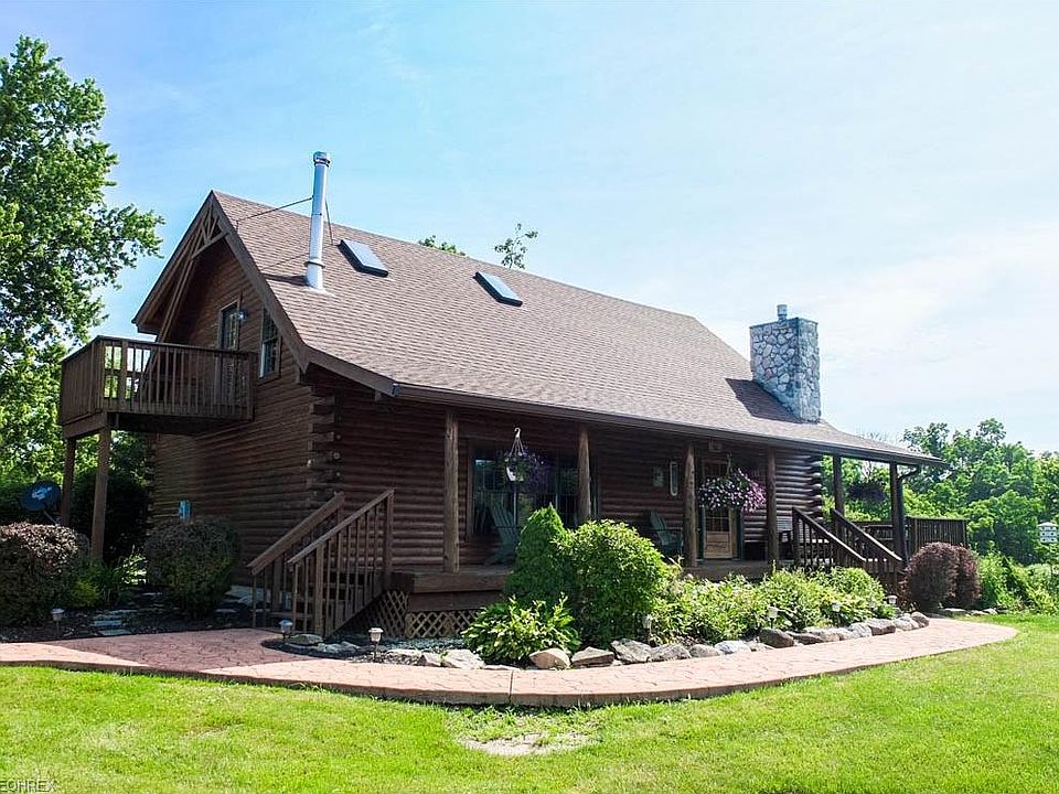 Sitting on over 6.5 acres with a private, stocked pond, this sun-filled log cabin offers a serene setting with ample amenities! The open floor plan features many attractive design elements including beautiful wood flooring, vaulted ceilings with wood paneling and numerous windows with scenic views! The gorgeous 2-story great room showcases a stone corner fireplace. The kitchen offers granite countertops, a breakfast bar and comes applianced with a refrigerator, range, oven and dishwasher. Enjoy views of the pond from the open dining room and kitchen. There's a convenient laundry room with half bath on the main level - a nice extra! First floor master suite has a walk-in closet and a pocket door to the private full bath with corner jetted tub, separate shower, linen closet, tile flooring and tub surround. Upstairs, there's a junior suite with a 9x7 walk-in closet, a private balcony overlooking acreage and a private full bath with a claw foot tub and vaulted ceiling. You'll love the impressive 26x14 loft overlooking the great room with exposed wood beams and a wall of windows with views of the pond! The finished walkout lower level has two rec room, a wood burning stove and a third bedroom with built-in bookshelves. The 2-car detached garage is 32-feet deep and has great above storage. Outside, you have the perfect entertaining space with the gorgeous, covered wrap around porch that spans three sides of the home! Don't miss out on your dream home - call today!