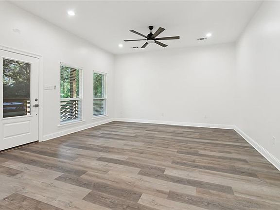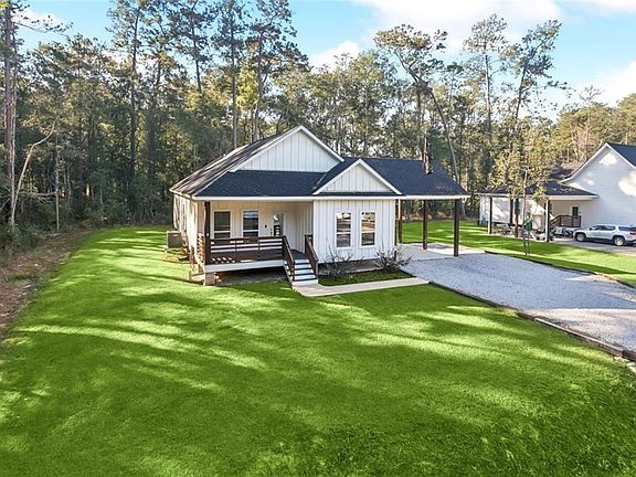 This charming cottage-style home, built in 2023, sits on a spacious half-acre lot with a peaceful wooded backdrop and plenty of room for boat or RV parking, plus covered parking. A large front porch welcomes you into an open, light-filled interior featuring vinyl plank flooring throughout, soaring 10-foot ceilings, and ceiling fans for added comfort. The open floor plan includes a stylish kitchen with a beautifully tiled backsplash, a stone island offering generous storage, a breakfast dining area, and abundant windows that flood the space with natural light. The expansive primary suite is a true retreat, complete with a soaking tub, walk-in shower, dual vanities, and a versatile bonus room perfect for a sitting area, office, or extra closet space. Three additional bedrooms offer ample space for family or guests, along with a full hall bath. A large laundry room with a utility sink and convenient half bath adds to the home's functionality. Located near I-12, shopping, restaurants, downtown Covington, and the Causeway bridge, this property blends comfort, style, and convenience in one inviting package.