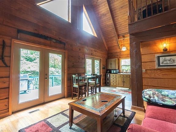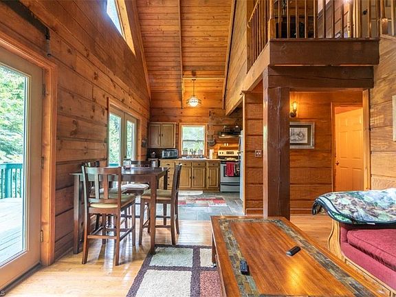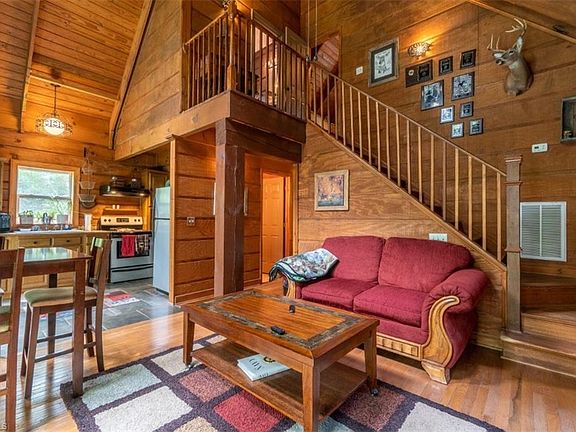 You will fall in love with this cozy log cabin with metal roof, nestled on 10 acres! A bedroom and full bath on each level! 2 dens - main level & basement with wood burning fireplaces. Kitchen with tile countertop and appliances to remain. Rustic wood ceilings on main and upper levels add warmth throughout. Private upper-level bedroom with personal balcony. Basement leads to patio with outdoor stone fireplace. Low county taxes, storage shed.