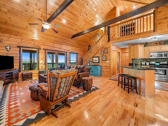 Have a view as majestic as the birds see! Perched high in the N GA mountains, this stunning true log cabin offers awe-inspiring, long-range layered mountain views & picture-perfect sunsets from nearly every angle. Custom craftsmanship greets you the moment you step through the stained-glass double front doors into the expansive, open living space. The main level is designed for gathering, featuring a spacious dining area & well-equipped kitchen with large breakfast bar peninsula, abundant cabinets & granite counters & stainless steel appliances. The great room showcases soaring vaulted ceilings with exposed beams, a cozy stacked stone fireplace & French doors framed with rustic log trim that lead to a sprawling rear porch, ideal for soaking in the panoramic views. A generously sized bedroom on the main floor offers more mountain vistas & connects to a spa-like bath with dual vanities, walk-in tiled shower, and direct access to the hallway & a laundry closet with washer/dryer hookups. Upstairs, an open loft leads to a charming guest suite with custom windows & French doors opening to a private covered balcony, the ideal spot to begin your day. A full bath with dual vanities & tub/shower combo completes the upper level. The terrace level is an entertainer's dream, featuring tall ceilings, stone fireplace, game area with pool table & cozy living room that flows out to another deck with private hot tub. This level also includes another bedroom & full bath, plus a large laundry/storage room, making it ideal for large families or groups seeking both connection & privacy. Enjoy extensive outdoor living space with wrap-around porches, a screened-in section on the main level & multiple decks to take in the views. Located on all paved roads, this property is just a scenic drive away from Morganton Point Rec Area, DT Blue Ridge, wineries, hiking trails & all the natural beauty the area has to offer. This is mountain living at its finest-elevated in every way.