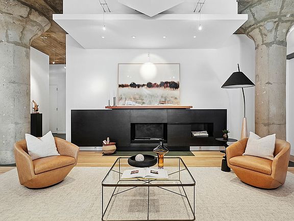 industrial triple glazed windows, each room boasts grand proportions and extraordinary detail. This home comprises approximately 2,311 sqft and features 2 bedrooms with 2.5 baths, a home office/library, laundry room, same-floor very large storage room, and a deeded parking space within the building’s private parking garage. The sprawling living room provides ample space to entertain in front of a custom-made EcoSmart fireplace.