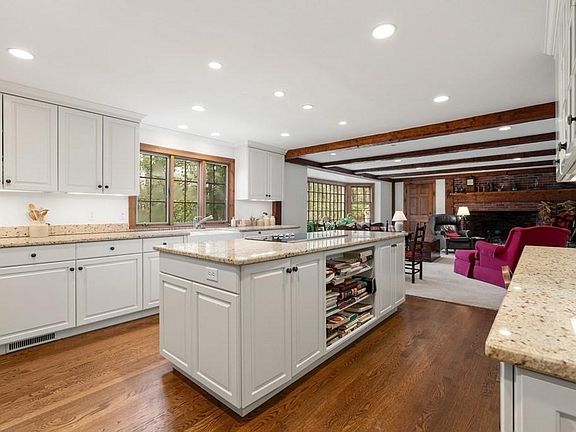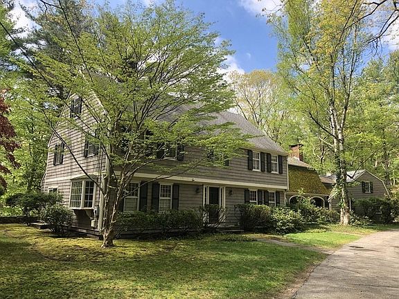 Nestled on a 2.63-acre wooded lot in the exclusive Weston Golf Club neighborhood this garrison and gambrel colonial offers over 4,000 square feet of sun-drenched space for easy living and entertaining. Hardwood floors, handsome millwork, built-ins, spectacular picture and wide-sill bay windows, French doors to stone-walled patio and a flowing floor plan showcase country elegance. Pastoral views are highlights of a gorgeous living room with fireplace and formal dining room, a welcoming study off a gracious foyer has a fireplace and full bath, granite kitchen with island/desk/pantry opens to a family room with bay window, cabinetry, rustic hand-hewn beams and stunning oversize brick fireplace with a cast-iron cooking arm, while mudroom has laundry, back staircase and access to breezeway and 3-car garage. Large master suite, five additional bedrooms, four full baths, walk-in/cedar closets on 2nd floor. Walk-out basement has finish potential. Bucolic setting has excellent commuter access