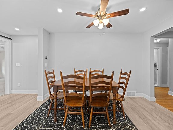 The home has been updated with a brand new kitchen featuring Corian countertops, a large island with breakfast bar, subway tile backsplash, stainless steel appliances, and recessed lighting. Sliding doors open to a paver patio and firepit, great for outdoor entertaining.