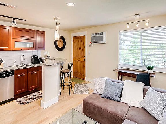 West Wash Park! 3rd floor condo unit with walk in closet. Appears bigger than 527 sq. feet would seem. King bed will fit in bedroom. Stackable washer and dryer in unit as well as updated appliances. Kitchen cabinets are now all painted white (brown in pictures). New flooring, new washer and dryer, microwave, dishwasher, fridge and water heater since pictures were taken.Rooftop and courtyard with BBQ available for use. No pets. Assigned parking spot included in back alley. Window unit AC in front room/Kitchen, portable AC available for use in bedroom. Property is ready for move in February 2026. Walking distance to many new restaurants/bars including uncle, the spot , as well as Washington Park! 6 month, 1 yr or 1.5 yr lease available.