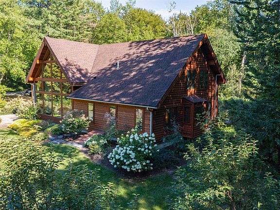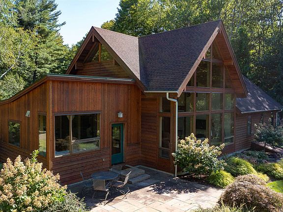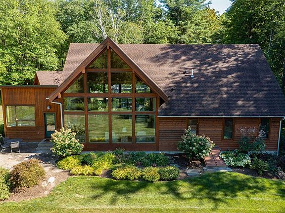 This is a gorgeous Lindal cedar home with modern touches on a quiet country road, 5 minutes to the center of Rhinebeck. This 2nd home was very gently used and extremely well taken care of. The Chefs Kitchen with vaulted ceiling leads into an expansive great room with 25 ft ceilings and enormous glass windows. The entire home is showered with natural lighting throughout the day and is an absolutely pleasant space to live and work in. There are two home office spaces, one privately and conveniently located off the 1st floor Primary suite. There is an additional guest bedroom and bathroom on the 1st floor, with 2 more bedrooms and a full bathroom on the 2nd floor. All bathrooms feature high end fixtures and tile work, while the main floors are sustainable bamboo. The home runs on a geothermal system and roof top solar array. There are sweeping lawns with extensive patio space and beautiful, mature plantings, great for entertaining. A hot tub hook up is already in place and a propane line run directly, for a future outdoor kitchen. There is a detached garage and full unfinished basement. Walk to Winnakkee Land Trust's Vlei Marsh Preserve. Peaceful, private, modern and a stones throw from the center of Rhinebeck.