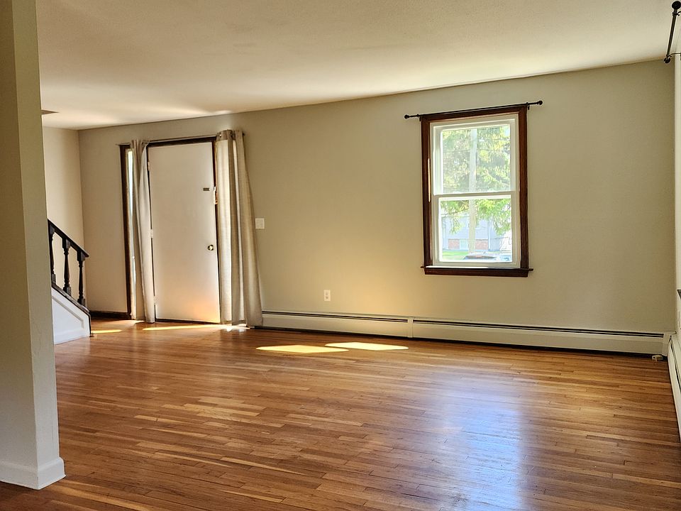 Upstairs there are 3 bedrooms and the full bathroom. On the main level is the large living room open to the dining space along side the kitchen and a half bathroom down the hall. Beautiful hardwood floors run throughout the unit. Extra space for storage is available in the unfinished basement and heat is included in the rent.