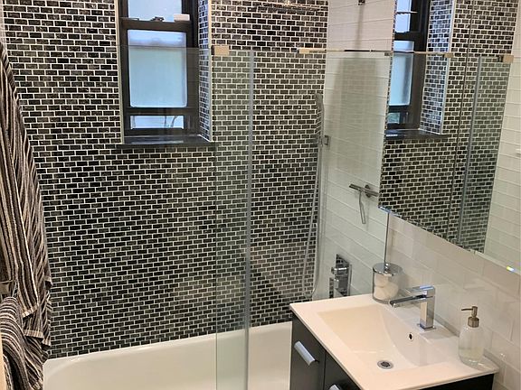 The bathroom showcases modern fixtures and finishes including a deep soaking tub, a large medicine cabinet and vanity providing lots of room for your toiletries.
