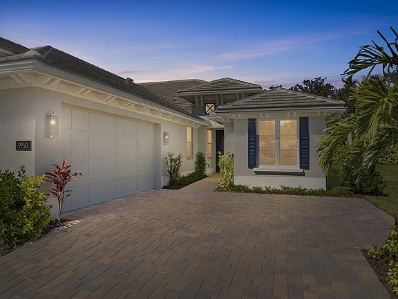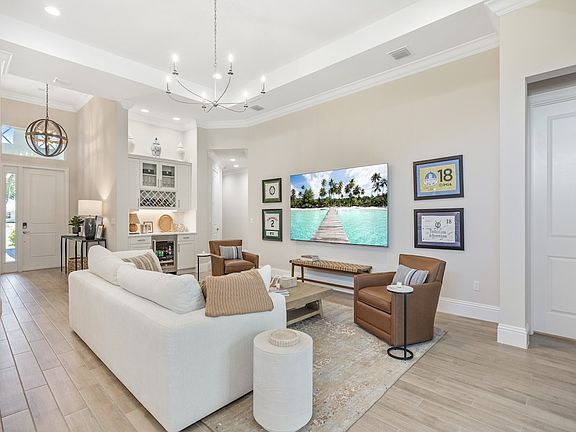 2025-built villa with 3BD/3BA, 11’ ceilings, crown molding & tile floors throughout. Split floor plan, large laundry, extended 2-car garage, natural gas cooktop with stainless appliances & wine bar. Primary suite offers 2 walk-in closets. Heated pool & spa with waterfall surrounded by lush palm foliage for privacy. Beautiful cul-de-sac setting in quiet area. Move-in ready. Less than 10 mins to the beach!