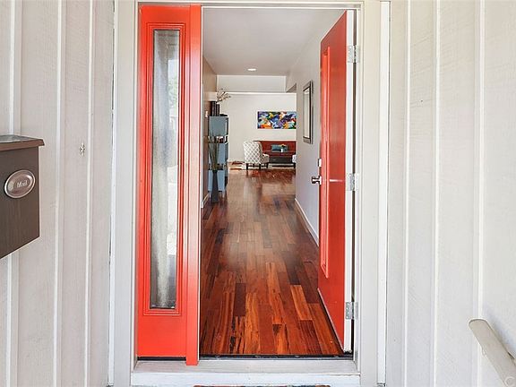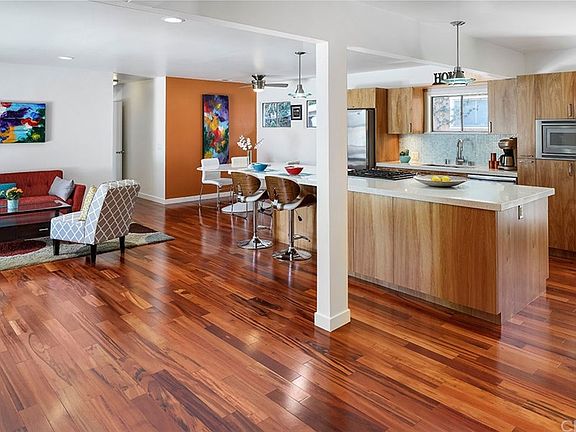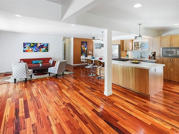 The charming appeal of 1950 Iroquois Ave begins at the curb with drought-resistant landscaping. The open design of this beautiful 4 bedroom/2 bath home with den, exudes a spacious and bright atmosphere. Multiple windows in the living room overlook the backyard and usher in volumes of natural light to highlight the rich tigerwood hardwood floors and modern decor. The main area is open and perfect for entertaining. The kitchen is the focal point with its chic wood cabinets and extra large island. The bright quartz counters and tile backsplash complement the stainless steel appliances. Stylish modern touches include the recessed lighting and silver light fixtures. The four bedrooms are all upscale and versatile, featuring a mix of carpeted and hardwood floors with sizeable windows and generous closet space. The 5th bedroom was converted into a comfortable den area, perfect for a TV or movie screen but can also easily function as a bedroom if need be. The master bedroom is a picture of relaxed elegance with hardwood floors, personal patio access through glass doors, and an impressive walk-in closet. The attached master bathroom stands apart as a striking contrast with tile floors and black/white tile walls with wood cabinets and a glassed-in shower. The patio leads to a polished and expansive backyard with more than enough room for outdoor cooking and dining. Ample trees offer plenty of privacy and shade. The double car garage can also be used as storage space or a workshop area.