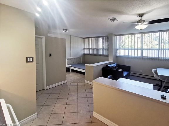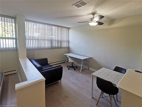 harming bachelor unit located in desirable West Hamilton. This main floor suite features updated light-toned laminate flooring, a neutral palette throughout, and a functional kitchen with tile backsplash, ceramic flooring, white appliances, and a breakfast bar perfect for casual dining. Oversized windows fill the space with natural light and offer a lovely escarpment view. A great option for first-time buyers or investors, plus heat, hydro, and water are all included in the condo fees.