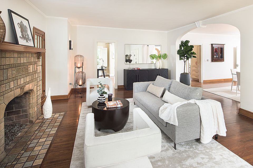 Set behind a gracious walled entry in the hills of Los Feliz, this authentic 1923 Mediterranean home fuses a sophisticated living plan and organic period charm topped off with views of Downtown L.A. Beyond a courtyard oasis studded with palms, the front door opens to a foyer and light-infused living room anchored by a Batchelder fireplace. With Hardwood floors throughout, a large dining room lined with arch-windows leads to a re-imagined chef's kitchen, featuring Carrera counters, Viking and Thermador appliances, and a cozy dining area connected to a terrace. Two bedrooms with walk-in closets are generous and bright, while an additional main level suite is ideal for an office or creative space. On the lower level, the Master Suite features a master bath with Nero Marquina marble countertops, and spacious walk-in closet. Exceptional landscaped grounds, including an expansive entertainer's patio and dining verandas, and private, off-street parking complete this Los Feliz property.