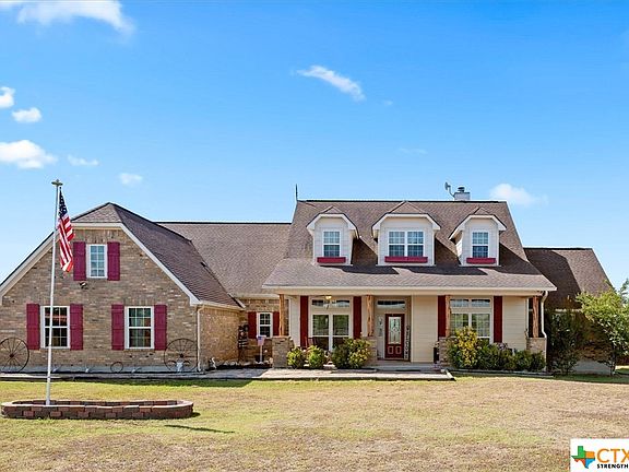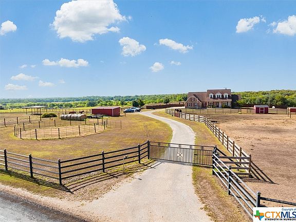Atop a hill minutes to booming Lockhart, this 3500+ sq. ft. home on 10 acres has 4 bedrooms, 2 full/2 half bathrooms and has been meticulously maintained. This Fredericksburg floor plan from Tilson is well designed with a foyer entry that leads to the formal dining room. You'll love the brick accent wall in the large kitchen. Electric cooktop and separate oven, island with seating, abundant cabinet space, and it overlooks the living/family room. Natural light and a fireplace along with high ceilings make this area welcoming. Just off the kitchen is a breakfast area and access to the back porch and beautiful gunite in-ground pool (2018). The fenced yard is peaceful and has stunning views. The master bedroom and bathroom are spacious--dual vanities, separate garden tub and walk in shower and fabulous walk in closet. A split level plan--the other 3 bedrooms are on the opposite side of the home. Each of these is spacious and share a hallway bathroom. An additional half/guest bath is just off the kitchen along with a generous utility/laundry room and access to the 3 car garage storage. Upstairs, the flex room with a half bath is a great place for entertaining guests, or secondary living space. A dedicated office with the best views in the home is just behind french doors. Horse stalls/metal barns convey.
