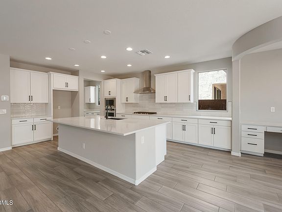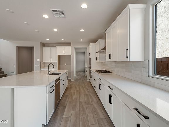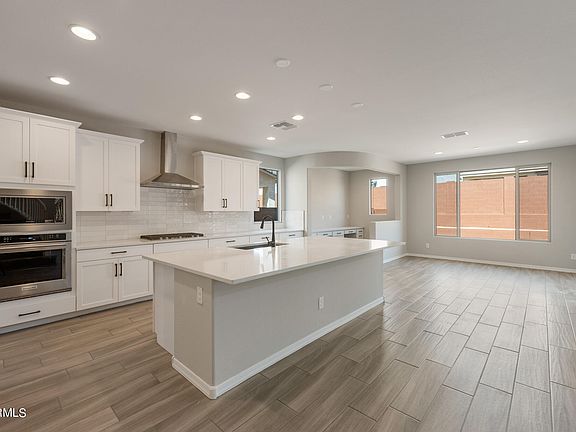 Two-story home with 2.5 car garage and first-floor suite. Chef kitchen with KitchenAid gas cooktop, 42'' white cabinets, quartz countertops, planning center, and Butler's Pantry. Features include upgraded tile, carpet, mission-style railing, laundry cabinets, whole-house electrical, surround sound wiring, Smart Home package, and soft water loop. Front yard desert landscaping and stunning interiors.