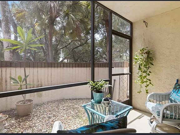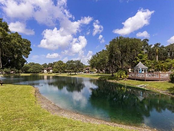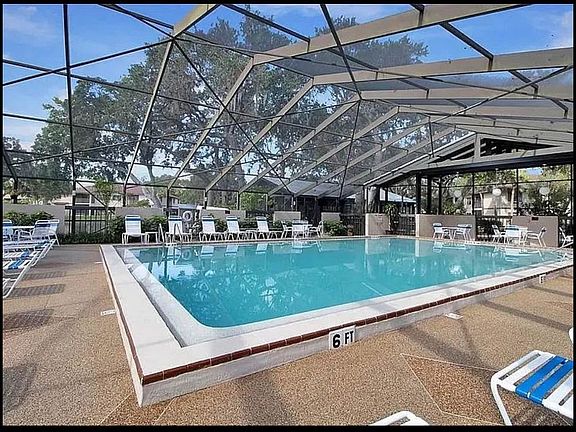 Beautifully maintained grounds with oak trees, picnic areas, community pool, and screened patio