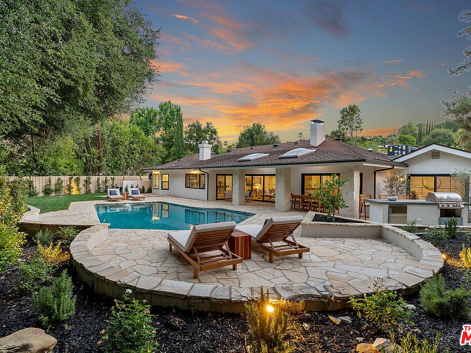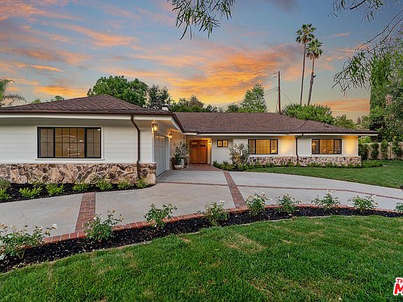 Step into a home where every corner tells a story of thoughtful design and unparalleled craftsmanship in the hills of Tarzana. Welcome to 19507 Valdez Drive. This completely renovated 3,234 sq. ft. single story masterpiece offers 5 spacious bedrooms, 4 luxurious bathrooms, and a seamless flow of extraordinary finishes that set this property apart. 19507 Valdez offers great privacy and beautiful curb appeal. A circular driveway welcomes you with ease, providing ample parking and a grand first impression. The property is framed by mature landscaping and blooming foliage. The heart of the home, a chef's kitchen, features a professional-grade Fisher & Paykel appliance package, custom white oak frameless cabinets, Roman Clay plaster hood, and Zellige tile backsplash adding organic texture and artisanal charm. The interiors unfold poetically with an open-concept indoor-outdoor living space, flowing through curated textures and design at every turn. The European oak flooring throughout the home offers a warm, textured finish with beautiful grain patterns. The living room flows seamlessly into the dining area, kitchen offering a space equally suited for everyday living as it is to elegant entertaining. The design continues in the primary bedroom, where wood paneling makes a bold yet tranquil statement, encompassing you in comfort and style. The expansive walk-in closet is the epitome of luxury and function. At the center, a custom-built island dresser anchors the space. Each bathroom is custom tailored for a heightened living experience, showcasing custom stonework that elevates the home's spa-like ambiance every detail, from the flooring to the vanities, speaks to a level of design rarely seen in today's market. With considerable square footage and meticulously designed living space, this home harmonizes luxurious materials with unparalleled craftsmanship.This private backyard is a true outdoor retreat, surrounded by lush, mature landscaping that creates a serene and secluded atmosphere. At the heart is a newly plumbed and plastered sparkling pool and spa. A spacious covered patio extends the living space outdoors, complete with lounge and dining areas ideal for year-round enjoyment. Just steps away, a fully equipped outdoor kitchen features a built-in grill, refrigerator, and bar seating designed for effortless al fresco entertaining. Framed by greenery and thoughtfully designed for comfort and style, this backyard is an entertainer's paradise and a peaceful escape all in one. This home was built for the discerning homeowner who appreciates timeless beauty and modern sophistication. Located on a quiet tree lined street and corner lot leading to a cul-de-sac the home is perfectly situated for peaceful living. Schedule a showing today!