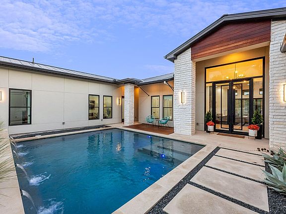 Sleek linear fireplacePrivate poolTranquil courtyardHill country viewsGlass-enclosed wine roomOutdoor livingPrivate marina