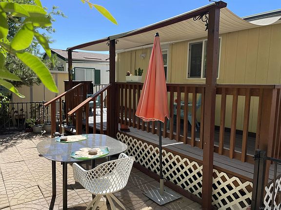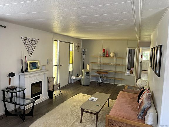 Great San Diego location in a beautiful Senior community! Spacious and remodeled, this home has been lovingly maintained. The home sits at the top of a hill on the best street in the park. Medium oak vinyl plank flooring throughout, white with soft gray accent walls, nice size living room with an electric fireplace and some newer vinyl windows. Both bedrooms have walk-in closets. The galley style kitchen includes the stainless steel appliances, ample storage and a utility closet that includes the washer and dryer. The front entrance has a security screen door and the side yard is covered. There is an addition to the home providing more space and the home has been releveled to code. The private, fenced backyard is perfect for a dog and backs up to a green, lushly treed hill side to enjoy nature. Plus a nice raised, pressure treated deck with roll down sun shades. The large carport can park 3 cars and it has a storage shed. Community has an immaculate retro clubhouse with dining room, brick fireplace, monthly classes, activities, pool and sauna. Best of all, No Property Tax, home is on annual registration! Bring your best offer!!