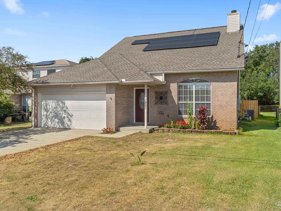 Welcome to this move-in-ready 4 bedroom, 2.5 bathroom home in East Navarre. Conveniently located just minutes from Hwy 98 and 87 - for easy commuting to I-10, local dining, shopping, grocery stores, and just 2 miles from the sugary white sands of Navarre Beach! Great location for local military bases, too! Just 10 miles to Hurlburt Field! This property features a 2022 Roof with paid off solar panels, a 2023 HVAC, and a 2017 water heater - ensuring peace of mind and low electricity bills! Through the front door of this split floor plan home, you enter the living room with vaulted ceiling that opens up to the second floor. Featuring a first floor primary suite with ensuite, laundry room leading to the 2 car garage, kitchen with breakfast bar, dining area just off the kitchen with a view of the expansive fenced-in backyard space, and a half bath for guests downstairs. The additional 3 bedrooms and full bathroom are up the stairs by the front door. Schedule your showing today!