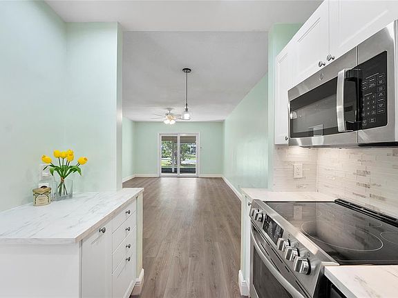 Beautifully remodeled ground floor 2 bed 2 bath condo in Lighthouse Point with assigned parking at your door. Renovated with top-quality materials, the open kitchen features stainless steel appliances and modern cabinetry. Luxury laminate floors, tile baths, and a primary bedroom with en-suite and barn doors to maximize space. Two walk-in closets and primary bath with walk-in shower and grab bars for persons with limited mobility. New impact windows and sliding door for peace of mind. Private patio with direct access to pool, clubhouse, and community areas. 55+ community with heated pool, putting green, shuffleboard, bocce, and BBQ area. One buyer must be 55+, others 18+. Perfect for seasonal or year-round living near beaches, shopping, dining, and entertainment. Low HOA and move-in ready!