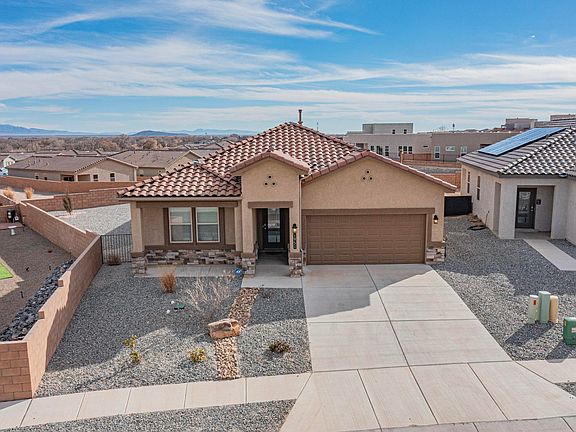 Come experience the enchantment of Tesoro at Fiesta subdivision, where spectacular mountain views await in the booming village of Los Lunas. Built on a prime lot, this DR Horton home showcases an open contemporary design with 4 bedrooms and 1 3/4 baths. The kitchen, a culinary haven, features granite countertops and a stainless steel appliance package, including a range hood, gas stove, refrigerator, and dishwasher! Flowing seamlessly into the family and dining areas, the floor plan is perfect for entertaining and creating memories. The primary bedroom offers a walk-in closet and an ensuite bathroom with marble countertops! Your weekend begins in the fully landscaped backyard, featuring a covered patio as the spot for relaxing evenings. Make this stunning property yours and call today!