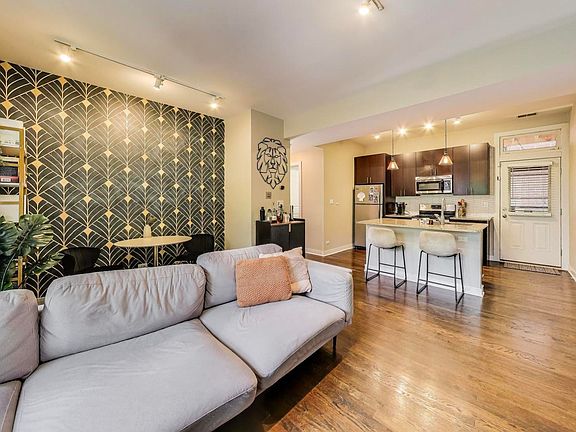 This 2-bedroom, 1-bathroom corner unit condominium is located in a boutique building in the electric North Center neighborhood with conveniences and nightlife all around. It is mere feet away from vibrant Lincoln Avenue, it's only blocks from the Irving Park and Addison Brown Line stations, and a CTA bus stop is found directly across the street, but the tree-lined street gives amazing neighborhood vibes. The North Branch of the Chicago River is a short walk away, as are the green spaces of Welles Park, Revere Park, Horner Park, and the Chicago Fire Pitch on the river. Trader Joe's is truly around the corner and blocks away. The home itself is impressively appointed. Hardwood floors are found throughout the central-air-conditioned space. The chef's kitchen features 42'' cabinets, a stainless steel suite, a breakfast island with storage and a sink, granite countertops, and a distinctive backsplash. A deck is located right off the kitchen. Both bedrooms boast walk-in closets with custom storage built-ins. The bathroom has an oversized vanity and a spa-quality soaking tub. Owners enjoy an in-unit front-load laundry/utility room and a private, 88-sq-ft storage room on-site.