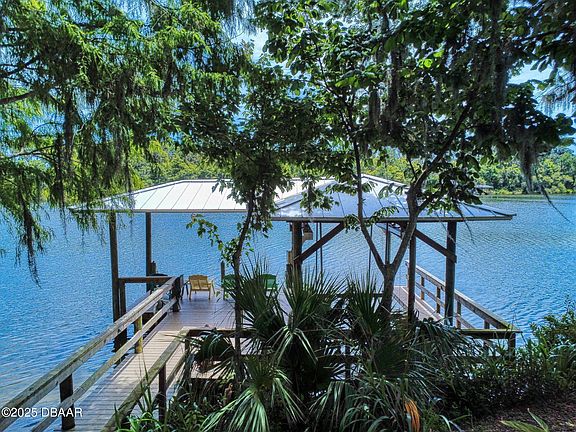 Beautiful 4 bedroom, 3 and a half bath, lakefront, pool home located in the highly desired gated community of Lake Waterford Estates in New Smyrna Beach. Lake Waterford is a 75 acre, spring fed lake perfect for boating, skiing, fishing and a number of other water sports. This spacious home sits on a 1.75 acre lot which is lush with a variety of mature trees, fruit trees and beautiful flora. Enter this home through the welcoming foyer where the eye is immediately drawn to the serene view of the tranquil lake in your own backyard. This home was designed for entertaining with a distinguished formal dining room and formal living room. The large primary bedroom, with expansive windows, letting in the beautiful views and two individual walk-in closets, will be a welcomed retreat at the end of the day. The ensuite bath comes equipped with double sinks, separate shower and a jetted garden tub. The 3 spacious guestrooms, each with ample closet space and natural light streaming through the windows, are comfortable and inviting. The hub of this amazing home is the open-concept, family room, dining nook and kitchen. This kitchen is a chef's dream with granite counter tops, stainless-steel appliances, gas stove and plenty of storage space. The kitchen opens to a dining nook and family room. As you enter the family room you are drawn to the massive natural stone fireplace. Exit the family room through custom, stained-glass french doors to your sparkling, screened-in pool and classic pavered patio deck. Sit and enjoy your morning coffee as you take in the beauty of life on the lake. Just beyond the pool is a pavered walkway that will lead you down to the boat-house and dock. This durable dock, made of WEARDECK material, is equipped with electricity, water and newer boat lift. What better way to end the day than with a relaxing boat ride or simply sitting on your own dock enjoying the beauty of nature in this breathtaking setting. Other outstanding features of this exquisite home: indoor laundry room with full bath, oversized 3-car garage, whole home diesel-powered generator, outdoor storage sheds, circular driveway, central vacuum system, custom stained-glass lighting and doors, high ceilings and plantation shutters. NEW METAL ROOF 2024. Air Conditioners, Refrigerator and Hot Water Heater new in 2024. The Lake Waterford Estates community amenities include a clubhouse, tennis courts and boat ramp. This sprawling, exquisite home offers the best of Florida living. This property is conveniently located less than 10 miles to the sandy beaches of New Smyrna and about an hour to the Orlando airport. Call today to schedule an appointment to see this truly spectacular and unique home.