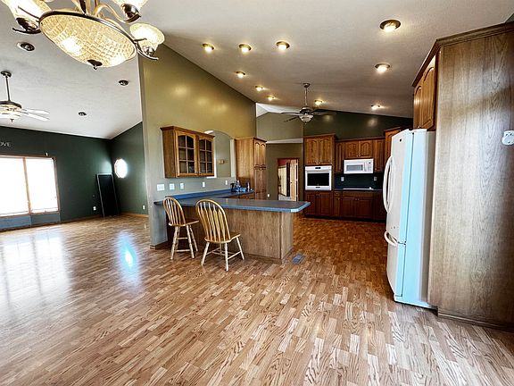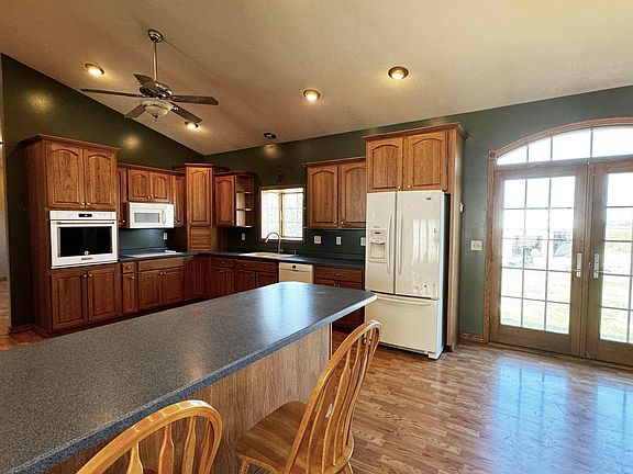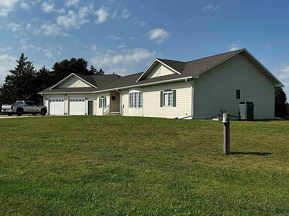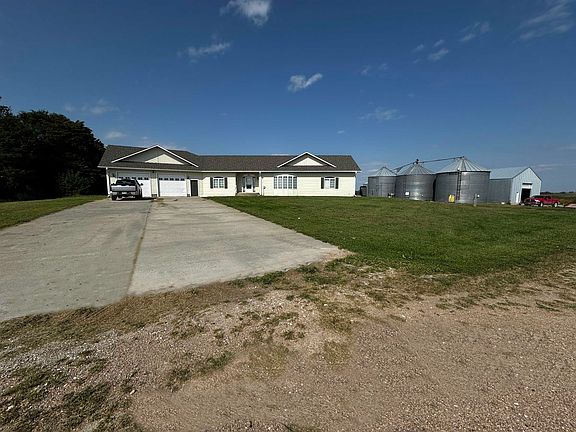 You must see this spacious acreage home that offers 6 bedrooms, with 3 on the main floor and 3 in the basement, all with egress windows, as well as 1 non-conforming bedroom or craftroom. It has 4 bathrooms. 3 On the main floor and 1 in the fully finished basement. It has an open-concept kitchen and dining area with vaulted ceilings, and a large living room with a cozy corn/pellet stove. Convenient laundry and mudroom are located off the kitchen and attached oversized 2-car garage. The finished basement boasts a large family room, game area with space for a pool table, Outside, the property includes 3 grain bins and a 50x120-foot shop, as well as an additional 3 car garage. Sq ft is approx.