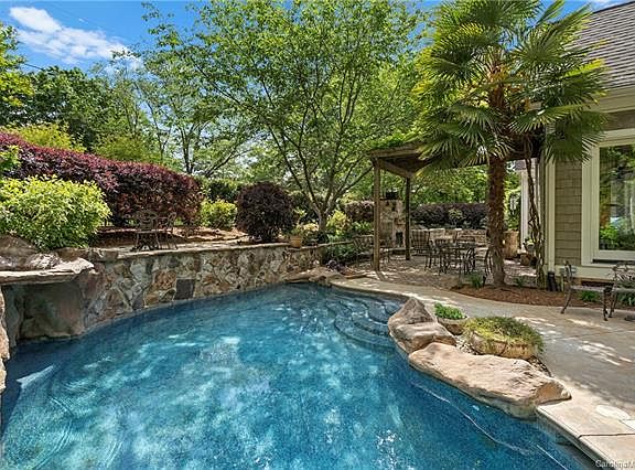 Charming English Cottage style home with pool & waterfall over rock cavern nestled into beautiful blooming gardens. Gather around the stone firepit with built in seating or sit under the vine entwined pergola with outdoor fireplace. Bright interior with high ceilings and great entertaining open floor plan. Updated chef's kitchen with custom lighting and quartzite countertops. 500 bottle wine room and formal dining room. 2 story great room with custom ceiling fan and gas fireplace. Master suite on main level overlooking the pool featuring sitting area. Views of Lake Norman year round from your front yard. Outside resort style area with built-in Lynx grill, mini refrigerator & stone fireplace. Outdoor bathroom on patio for use while poolside. Freshly painted and meticulously maintained with dream floor plan. 2nd floor features 3 additional bedrooms, as well as 2 bathrooms. Third floor could be used for private office/bedroom/media room (wired for media room). Sealed crawl space.