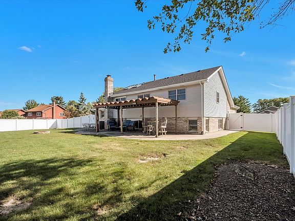 Welcome to this exquisite 4-bedroom home that truly has it all! As you enter, you'll be greeted by a grand 2-story foyer with soaring cathedral ceilings and skylights that flood the space with natural light. The recent updates are apparent throughout, starting with the beautifully updated kitchen. Enjoy cooking in style with brand-new cabinets, a striking backsplash, and luxurious quartz countertops. The eat-in kitchen boasts a breakfast bar, a closet pantry, and decor appliances. The home features solid core two-panel interior doors, white wood trim, decorative railings, and fresh interior paint in living areas, all contributing to its sophisticated charm. Central air conditioning, new in 2023, ensures year-round comfort, while the architectural roof and new gutters (installed in 2024) offer peace of mind. Refinished hardwood flooring flows seamlessly through most of the home, complemented by carpeting in the bedrooms, replaced in 2020. Step outside to discover one of the largest yards in the neighborhood (1/2 acre), fully enclosed by a 6-foot vinyl privacy fence. The expansive outdoor space includes a circular driveway, a spacious concrete patio with a charming pergola, and a 12x12 concrete-floored shed for all your storage needs. Located in the heart of Mokena, this home is conveniently close to schools, parks, shopping, the movie theater, the Metra train, and I-80. The primary bedroom is a retreat of its own with a spacious walk-in closet and a bathroom featuring a separate shower and a soaker tub. The lower level family room offers a cozy brick gas-start fireplace, perfect for chilly evenings. The 2-car attached garage features epoxy flooring and a wall-hanging slat system, making it a dream for organization and ease. All thermopane windows have been updated. This move-in-ready gem is waiting for you-everything has been done! Don't miss the opportunity to make this dream home yours.