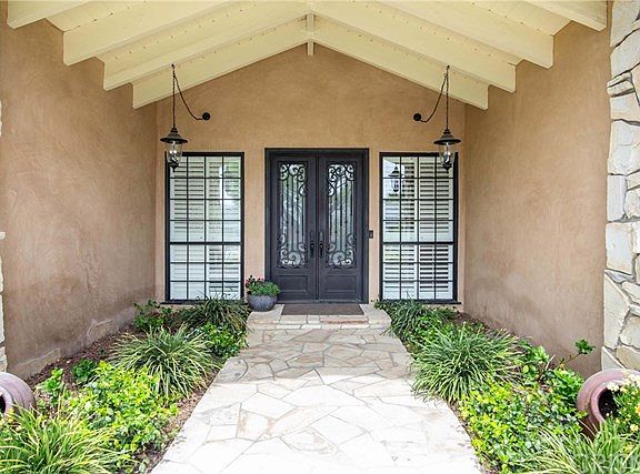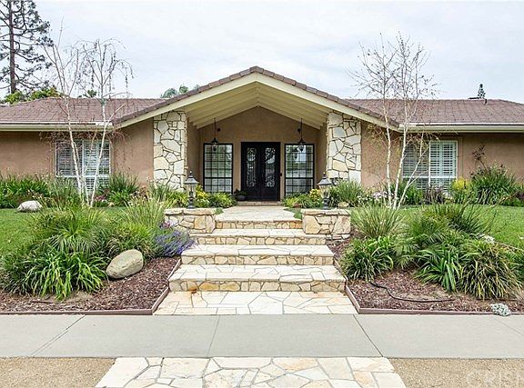 Devonshire Country Estates sprawling single story traditional! Prestigious curb appeal, very stately lines! From the moment you arrive, it will be love at first sight! Over 2800, sq ft, 4 bdrm, 2.75 baths, Formal Dining Room & Family Room. One of the nicest streets in Northridge! Pride of ownership, spacious lot w/ expansive lawns & huge gated RV access. Extensive stonework leading to glass / bronze iron double door entry. Wood floors, crown moldings, oversized baseboard & casings, recessed lights, built in ceiling speakers, mostly dual paned windows & plantation shutters, skylight & ceiling fans. Shows like a model home! Rich remodeled kitchen w/ granite counters & walk in pantry. Formal Dining Room w/ wainscoting & crown molding. Elegant Living Room, impressive brick fireplace, custom wood mantel & surround. Newer copper pipes, remodeled bathrooms, just re roofed & smooth Santa Barbara stucco finish . 2 separate bedroom wings, perfect for privacy & separation, 3 on one side, Master on the opposite side. Scrumptious master bath w/ walk in curbless shower, frameless glass, jetted spa tub & dual vanity & sinks. Stunning stone, granite & high end finishes. His and Hers customized closets too. The bedrooms are all generous in size w/ lots of built-ins & closet space. Professionally landscaped, lush amazing yards, blooming flowers galore! Sprawling covered patio, runs most of the length of the house, so much space for entertaining! This is a must see home, only 2 owners.